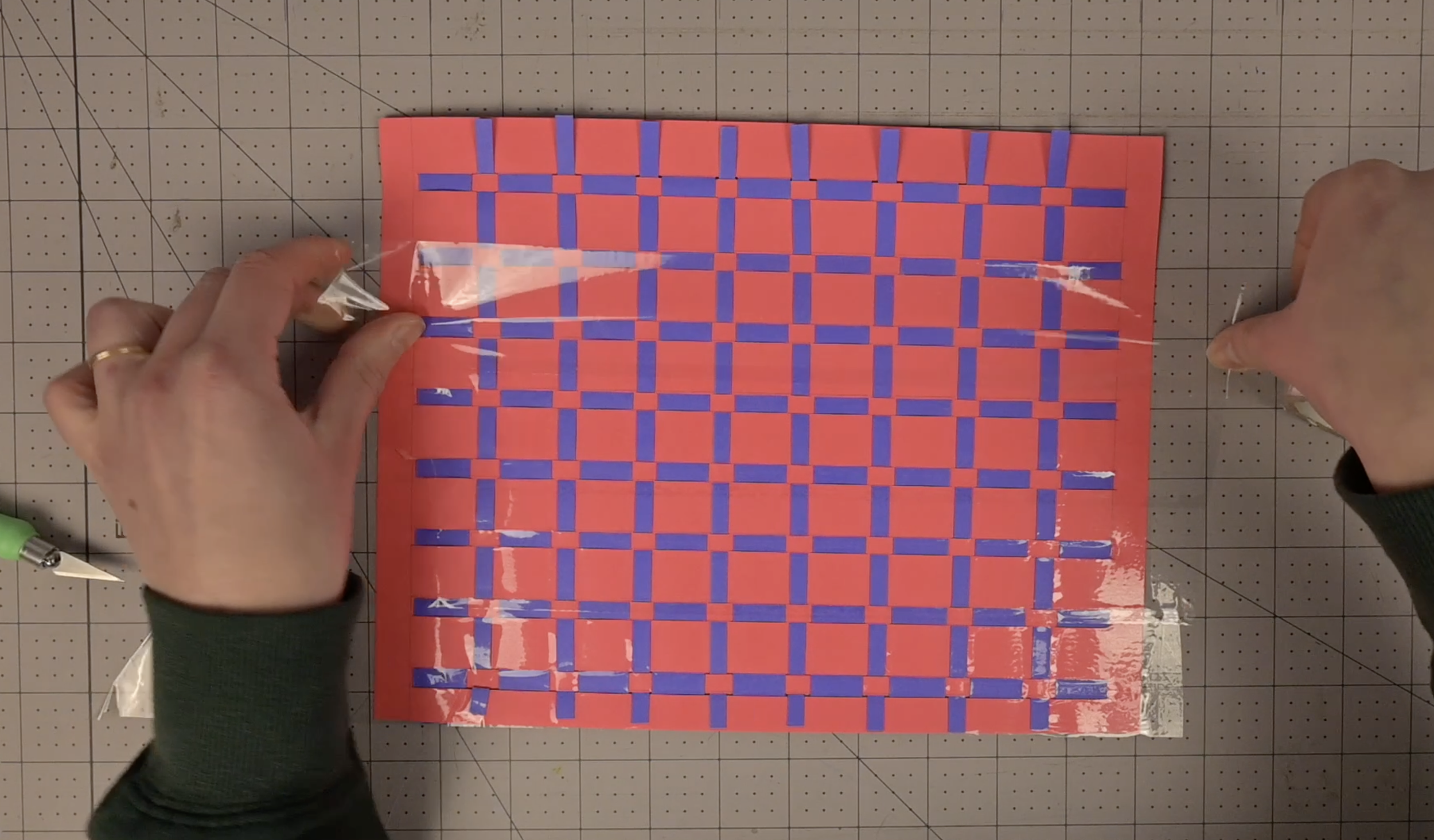 Apply a small amount of glue stick to the loose ends of your woven strips and press them firmly onto the back of your base paper.
