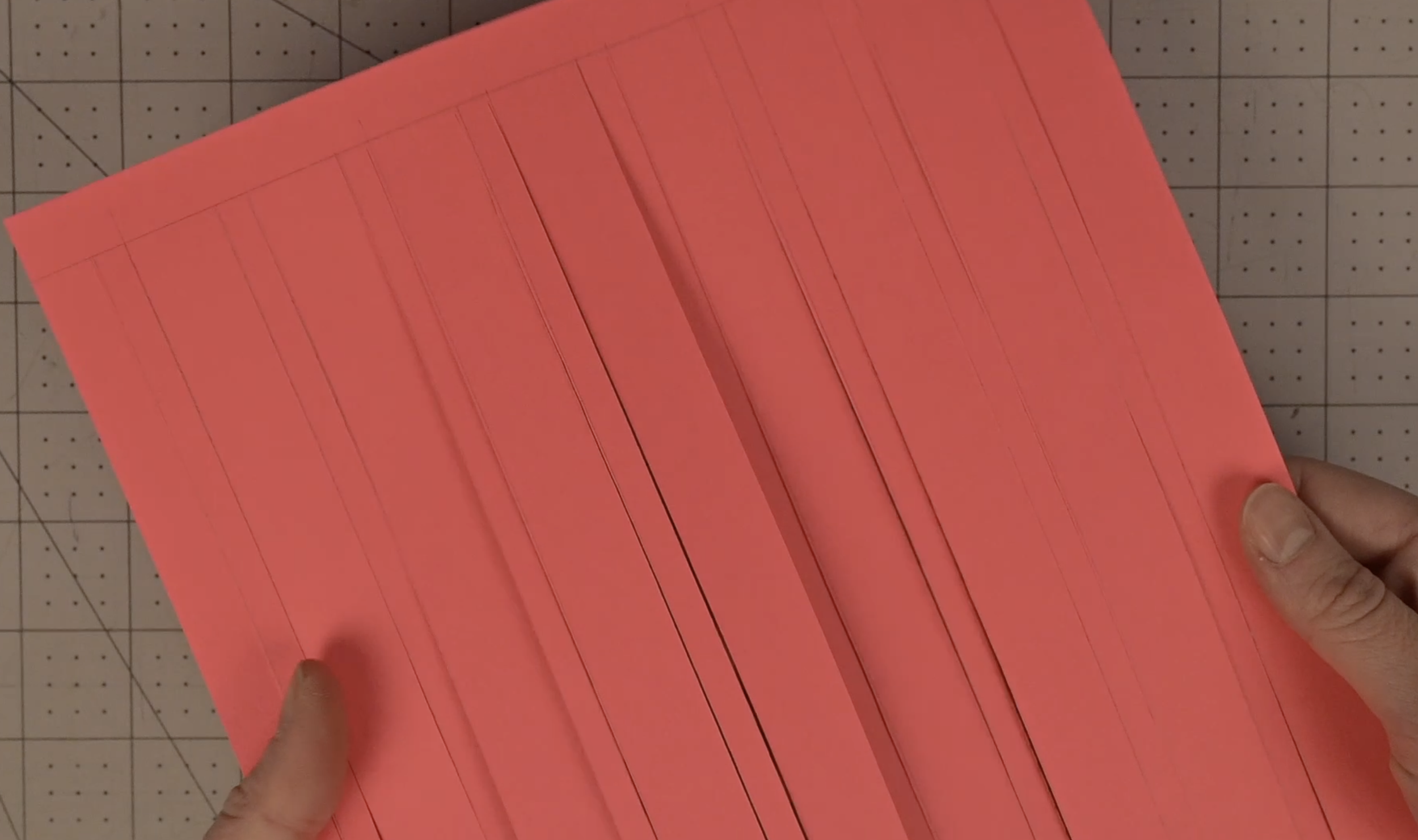 Cut on the vertical lines. Remember not to cut past the horizontal drawn line.